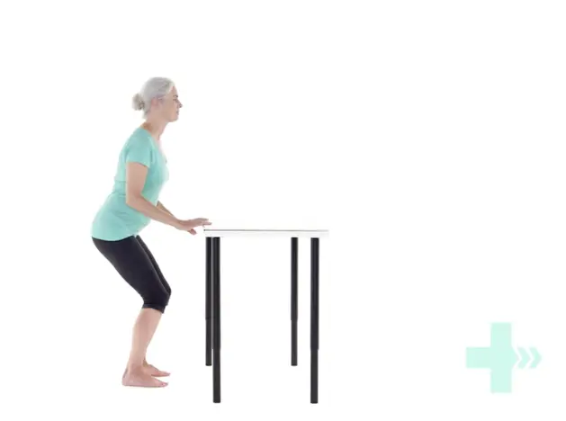 - Slowly bend your knees, lowering your hips as if sitting back into a chair.